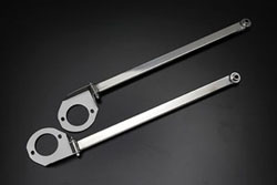 スポーツ走行を前提に、オーリンズ製ショックアブソーバをベースに、減衰特性、ストローク長などをマインズ流にアレンジ。直巻スプリングの採用により、20段の減衰力調整と、ネジ式の車高調整機能により、幅広いセッティングが可能となっています。またストラット形状のタイプは、フロントのキャンバー角の調整も可能です。アッパーマウントには、ピロアッパーマウントを採用し、よりダイレクトにサスペンションの動きをボディへと伝えます。スタビライザー、ハイグリップタイヤなどの併用で、より高次元の性能を発揮します。